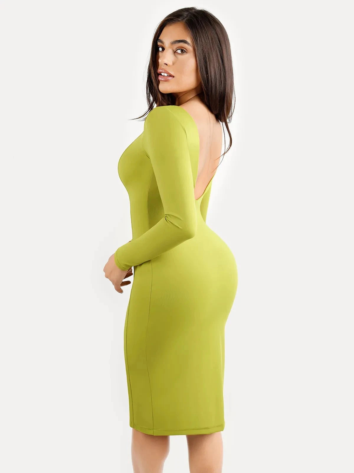 Popilush® Formal Bodycon Party Winter Dress Built-In Shapewear Long Sleeve Crew Neck Backless Midi Dress