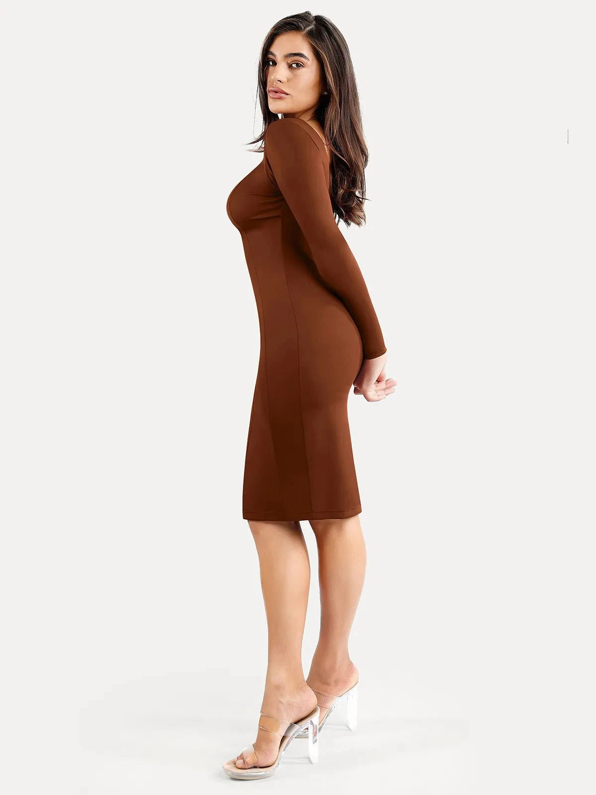 Popilush® Low Back Formal Bodycon Party Winter Gown Brown / S Shapewear Long Sleeve Boat Neck Sculpting Midi Dress