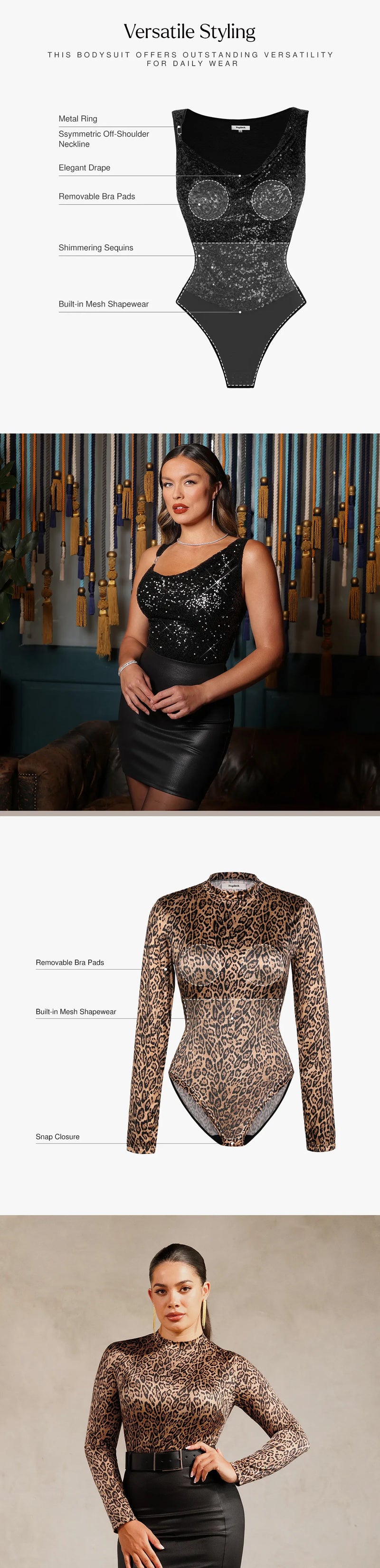 Popilush® Sequin Cowl Neck Chain Detail Sculpting Bodysuit
