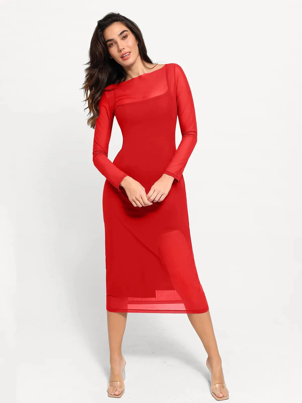 Shapewear Slimming Midi Dress and Sheer Mesh Overlay Set