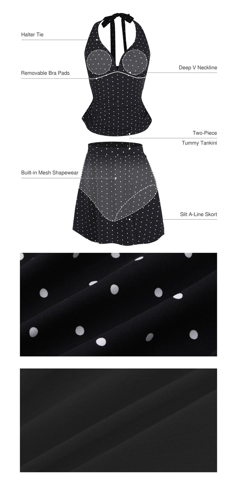 The top is long enough to cover the abdomen, suitable for those who want a bikini style without showing the midsection. It doubles as a swimsuit and bodysuit. The adjustable halter neck with a deep V-neck allows for a customizable fit, balancing support and comfort, while defining the neckline and showcasing the bust. The high-slit A-line skirted bottom covers the upper thighs, with a slit visually elongating the legs. It has an inner shaping structure that cinches the waist and abdomen.