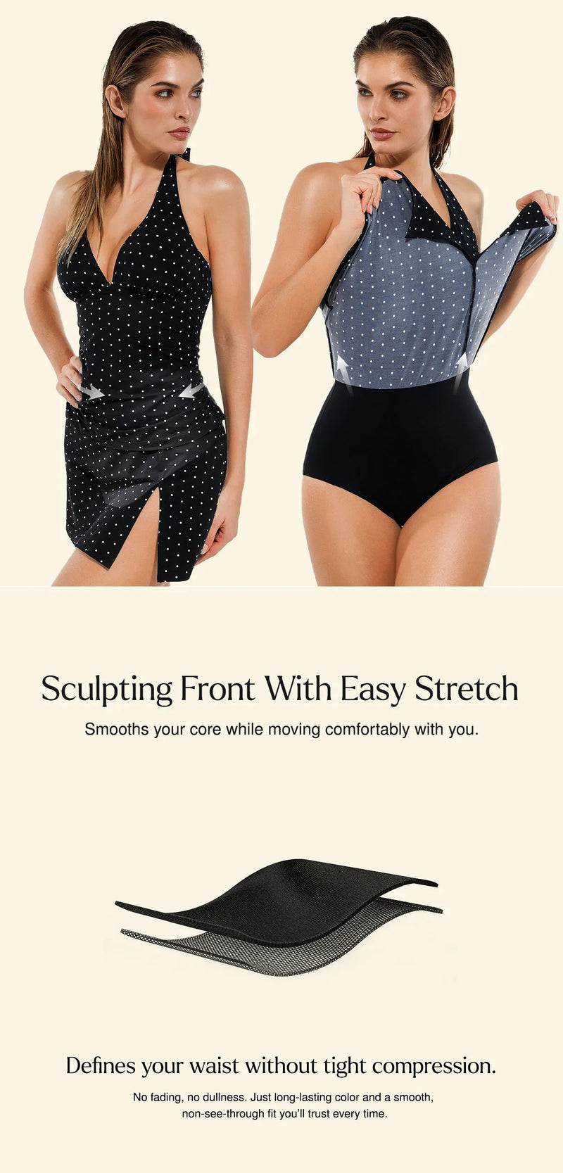 Combines outerwear, shaping, and eliminates the need for a separate bra or underwear. The skirt has an inner layer of shaping mesh for abdominal control. The top includes removable padded cups and an elastic underbust band for better support. The gusset uses quick-drying fabric keeping you comfortable.