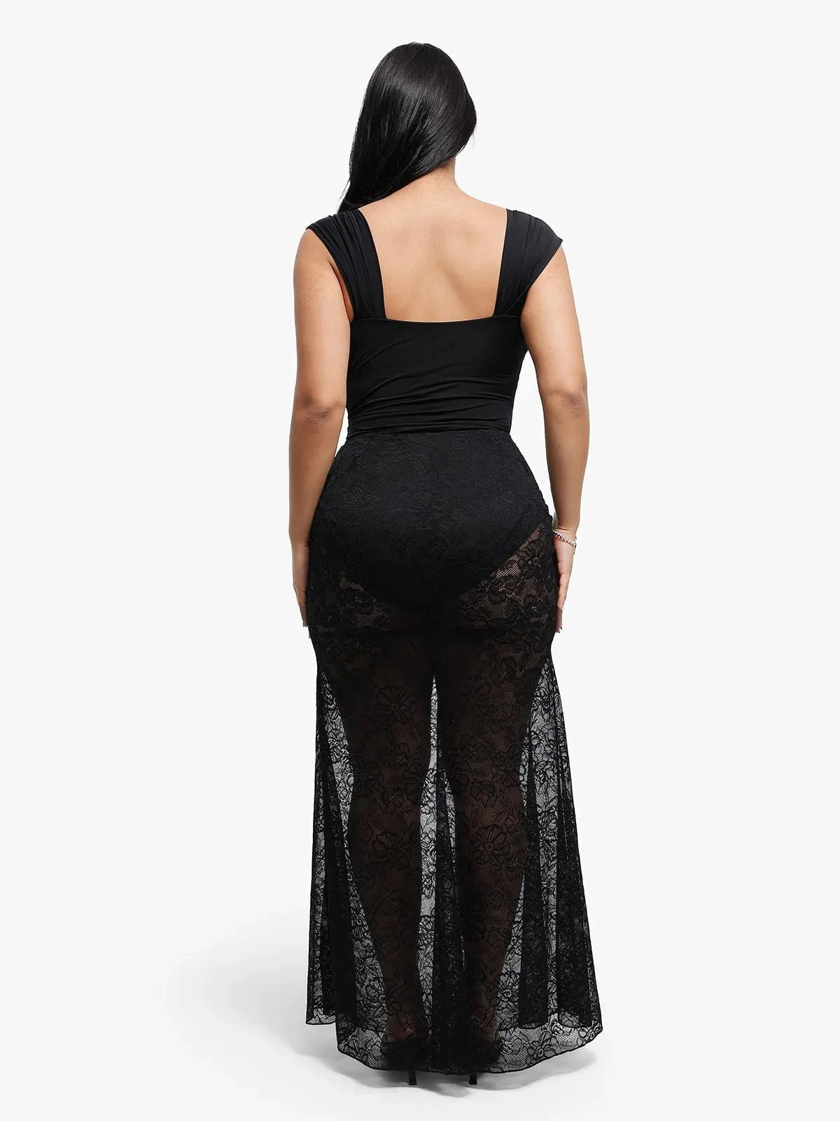 Shapewear Cap Sleeve Bodysuit Lace Fishtail Coverup Skirt Set