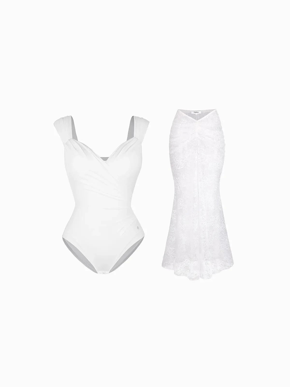 Popilush® Bodysuit / White / XS Shapewear Cap Sleeve Bodysuit Lace Fishtail Coverup Skirt Set