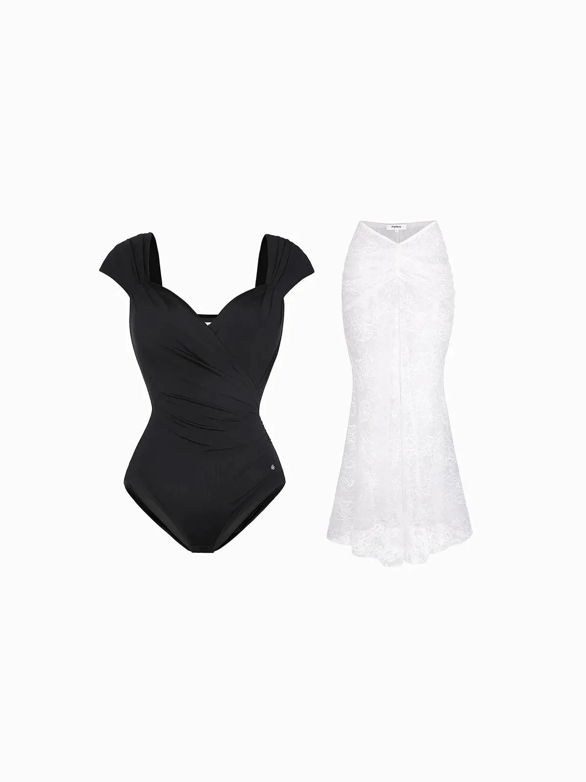 Popilush® Set / Black/White / XS Shapewear Cap Sleeve Bodysuit Lace Fishtail Coverup Skirt Set