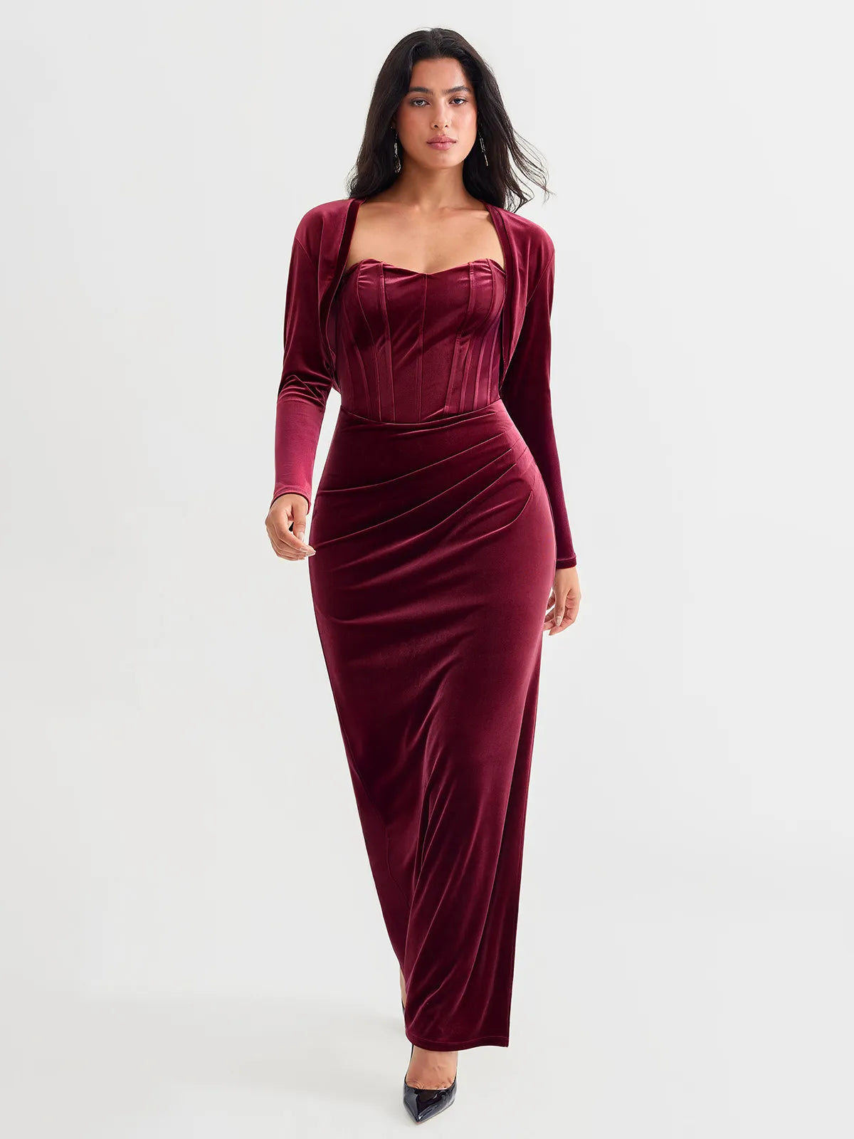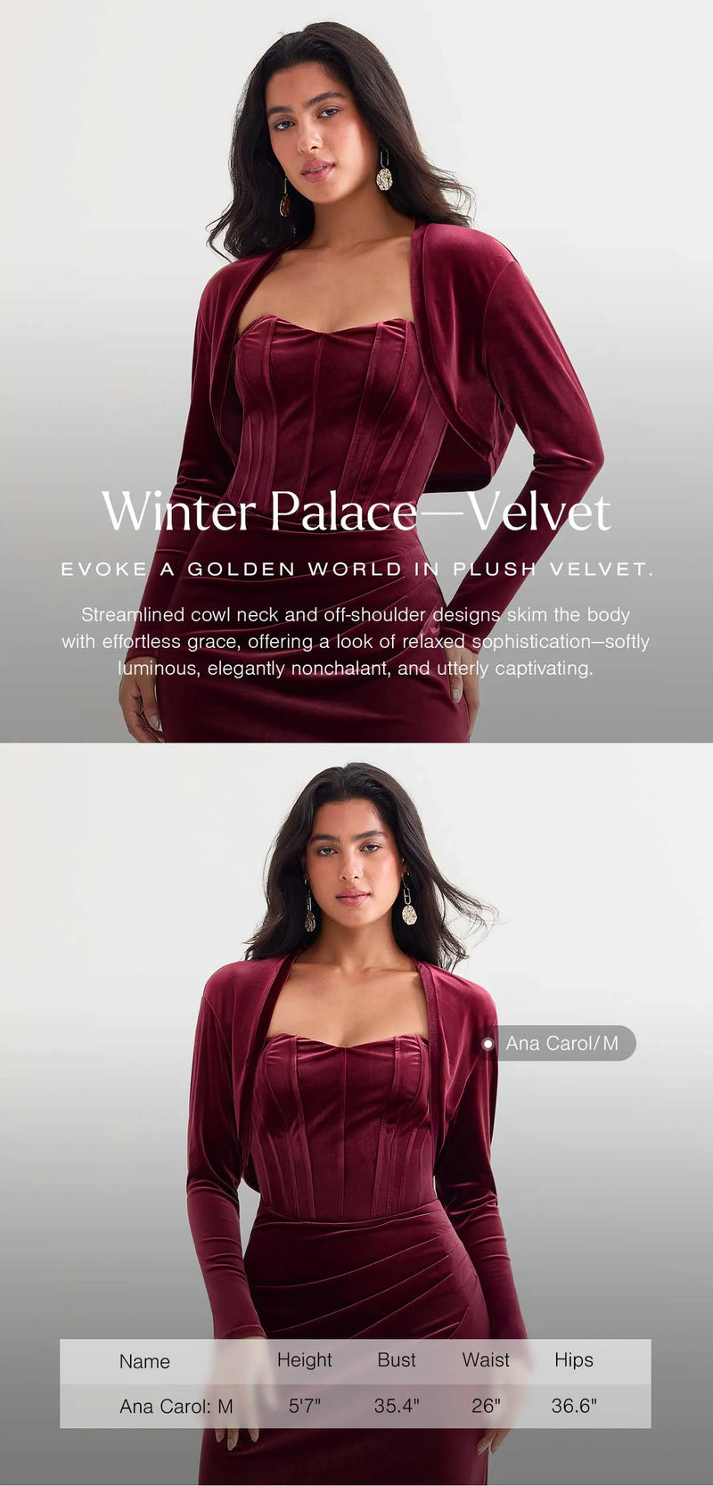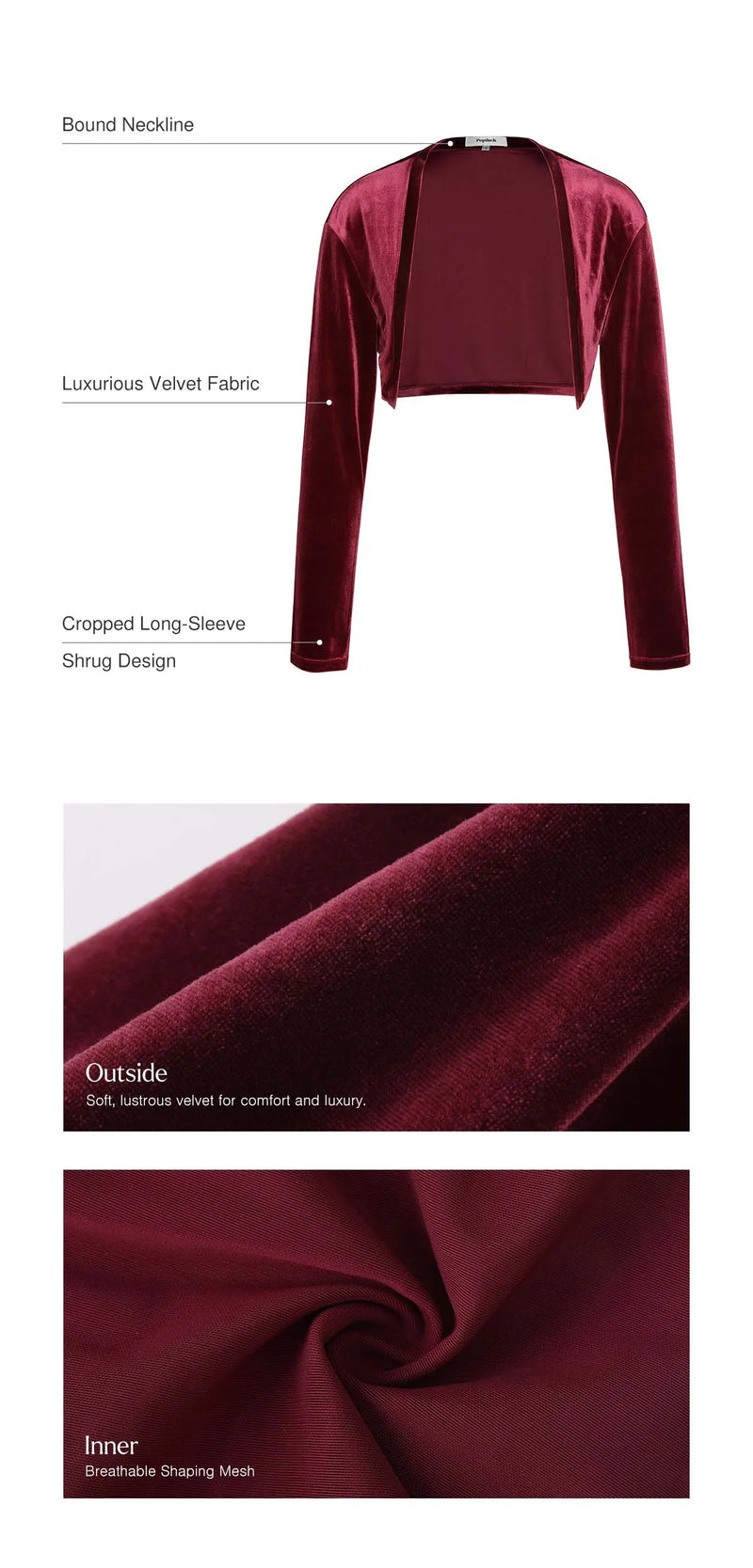 This velvet top features elongated sleeves extending to the thumb and a cropped silhouette, perfect for pairing with dresses or high-waisted bottoms. Luxurious velvet fabric with a soft sheen and smooth texture exudes sophistication.