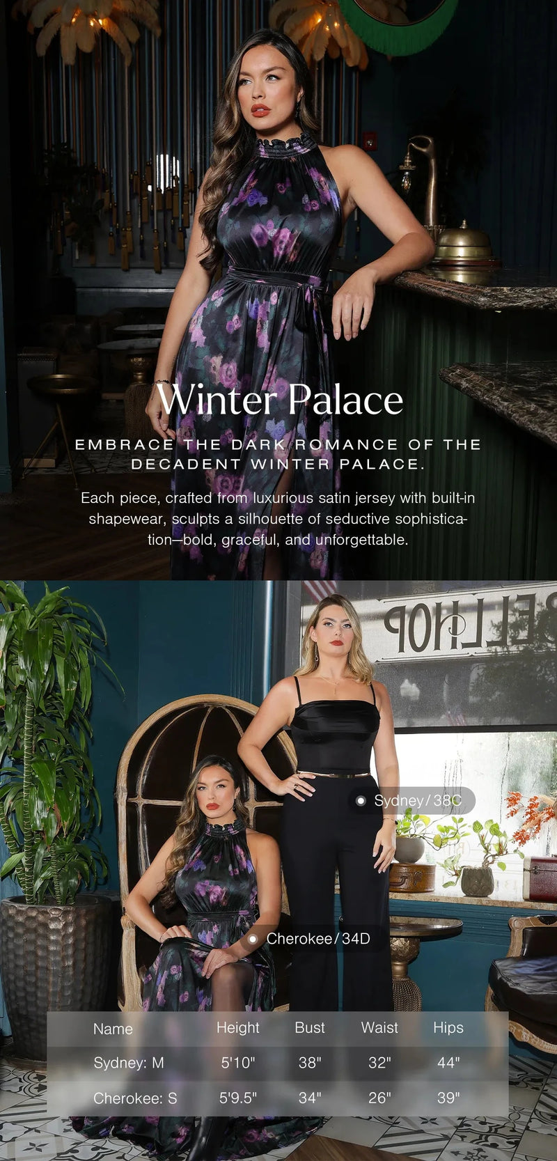 150D printed glossy fabric with four-way stretch and satin sheen feels like a second skin. Breathable mesh lining supports light shaping. Purple-on-black blurred floral print creates a soft, romantic, vintage-inspired look.
