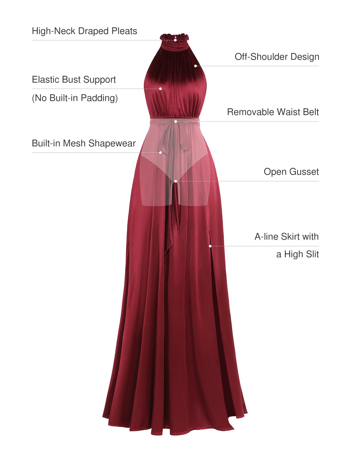 Off-shoulder design highlights arms and neckline for a light, elongated look and easy layering. High-neck draped pleats refine the lines of the neck, while the A-line skirt with a high slit optimizes waist-to-hip proportions and naturally showcases the legs.
