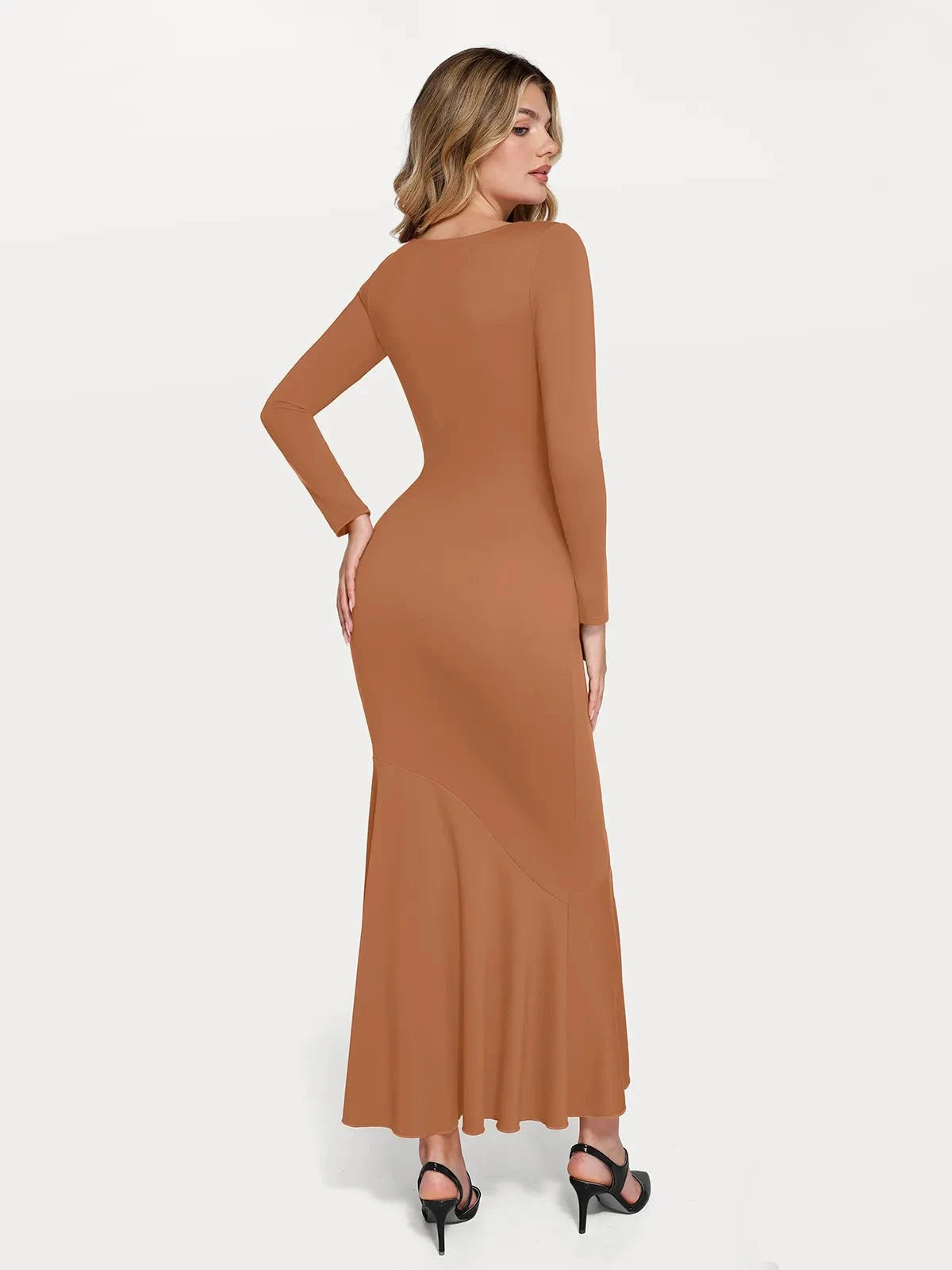 Popilush® Sculpting Formal Party Bodycon Winter Cocktail Gown Brown / S Shapewear Long Sleeve Lace Trim Sculpting Mermaid Maxi Dress